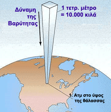 Πιο συγκεκριμένα λοιπόν, έχει υπολογιστεί ότι το βάρος της στήλης αυτής που βρίσκεται από πάνω μας και σε όλο υψος της στήλης της ατμόσφαιρας είναι 1 κιλό ανα τετραγωνικό εκατοστό άρα 10 ΤΟΝΟΙ ΑΝΑ ΤΕΤΡΑΓΩΝΙΚΟ ΑΠΟ ΠΑΝΩ ΜΑΣ!